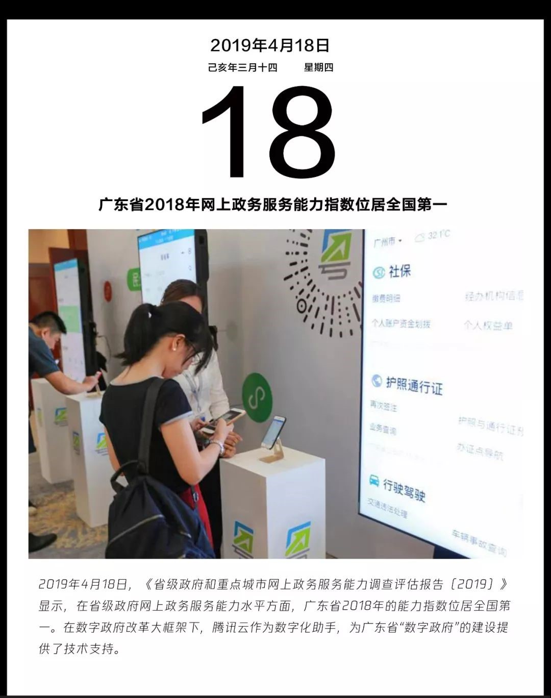 騰訊致力於用科技改變生活。在與國計民生息息相關的政務領域,騰訊已經探索了數字技術助力數字政務發展、提升民眾服務的經驗和模式。曾被稱為廣東省“一號工程”的“數字廣東”項目,是在廣東省政府的領導下,由騰訊聯合三大運營商共同建設。騰訊所打造的“3+3+3”數字政府平台建設模式提升了廣東省的政務能力。其中,國內首個集成民生服務的微信小程序“粵省事”,截至目前註冊實名用户1800萬,平均每7個廣東人中就有1人在使用,上線744項高頻服務中有651項實現“零跑動”,91項“最多跑一次”。廣東省2018年的網上政務服務能力指數位居全國第一。