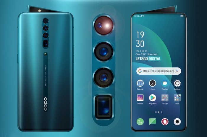 在保留鯊魚鰭彈出式前置攝像頭之外,機身背面裝備了先進攝像頭系統,並採用中心垂直對齊方式。有別於10倍變焦版中將閃光燈放在相機的右側,插圖中沒有發現閃光燈,不過在三攝上方有兩個小圓圈。在規格上應該會在Reno十倍變焦版本基礎上有所提升,Reno 十倍變焦版本裝備了4800萬像素的主攝,1300萬像素的長焦鏡頭和800萬像素廣角鏡頭。