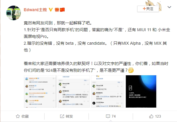 10月1日消息,微博認證為小米公司中國區品牌推廣經理、發佈會總統籌@Edward主教一句“只有MIX Alpha、沒有MIX其它”暗示今年可能沒有MIX 4。