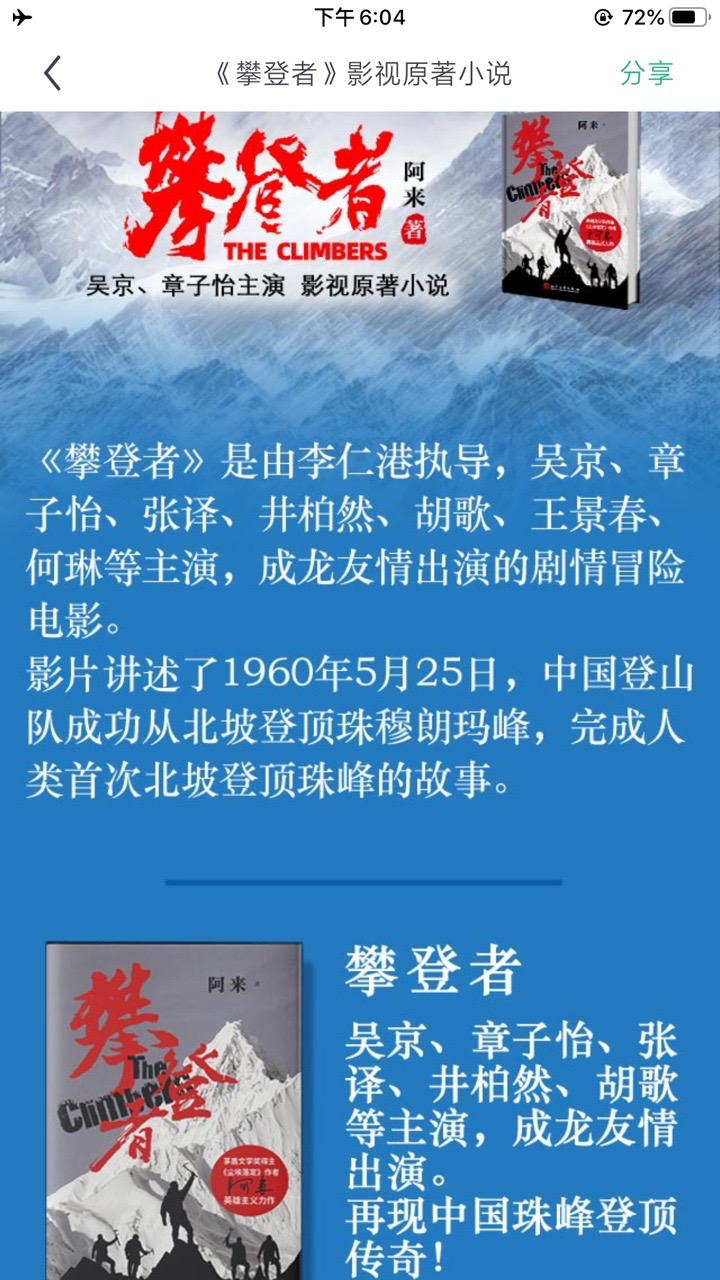 電影《攀登者》今日正式公映 原著小説上架書旗小説