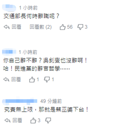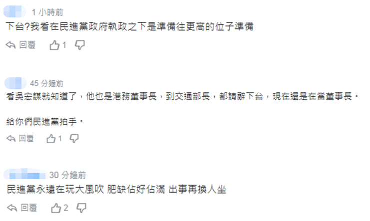還有網友諷刺稱,下台?我看在民進黨當局執政之下是準備往更高的位子去;看吳宏謀就知道,他也曾是港務公司董事長,在"交通部"請辭下台後,現在還是(台“中華郵政”)董事長↓