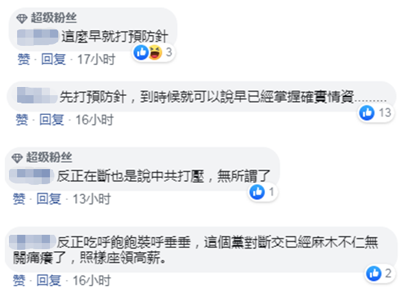 還有網友則看破蔡當局"套路"嘲諷稱,這麼早就打預防針;到時候就可以説已經"掌握確實情資";反正"斷交"也是説大陸"打壓";照樣坐領高薪↓
