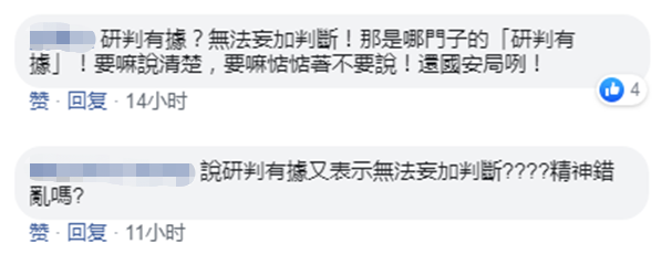 對於邱國正此番言論,有島內網友質疑稱,“研判有據"又"無法妄加判斷”?這算哪門子的"研判有據”!要嘛説清楚,要嘛不要説;精神錯亂嗎?↓