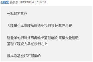 有網友稱讚,“大陸學生本來理論就遠比我們強,比我們紮實”,“台灣重大工程不應該排除大陸來競標,大陸基礎建設又快又好”。↓