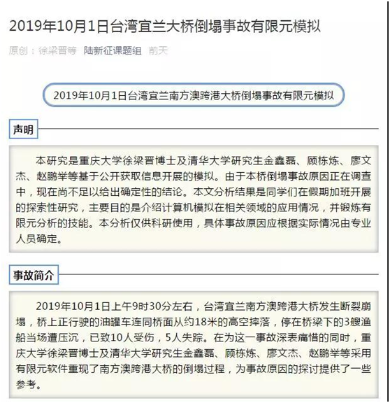 報道稱,重慶大學博士徐梁晉和清華大學研究生金鑫磊、顧棟煉、廖文傑、趙鵬舉等5人,從公開的媒體信息中搜集數據,展開仿真分析,利用MSC.Marc通用有限元軟件,建立三維有限元模型,仿真這次倒塌事故,這篇文章在網絡上被廣傳。不過,發表人在文中也聲明,斷橋倒塌事故原因正在調查,還不足以給出確定性的結論分析的結果,只是在假期中加班開展的探索性研究,主要目的是介紹計算器模擬在相關領域的應用情況,並鍛鍊有限元分析的技能,為事故原因提供參考。