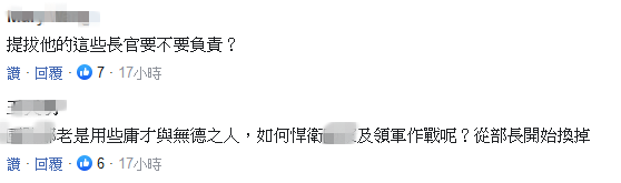有網友稱,“提拔他的這些長官要不要負責?”還有網友批評台防務部門稱,“老是用些庸才與無德之人”,呼籲“從‘部長’開始換掉”。