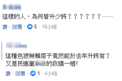 對於這起醜聞,有島內網友質疑,“這樣的人,為何晉升少將?”“這種色狼無賴痞子竟然能於去年升將官?又是民進黨‘執政’的政績一樁!”