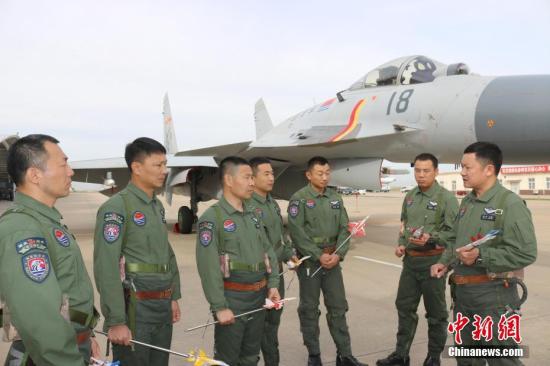圖為9月19日,參加此次閲兵的艦載機梯隊飛行員張葉、盧朝輝、徐愛平、王亮、袁偉和備份機飛行員劉孟濤、鄧偉進行航線討論。中新社記者 郭超凱 攝