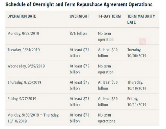 在隔夜貸款利率於9月17日驟升至10%後,紐約聯儲9月20日正式宣佈開啓每日例行隔夜回購操作模式,稱為了幫助聯邦基金利率保持在目標區間之內,其公開市場交易台將進行隔夜回購操作直到10月10日,每次操作的總金額至少為750億美元;同時交易台還將進行3次14天的定期回購操作,每次操作的總金額至少300億美元。這是美聯儲十年來首次採取這種補救措施。