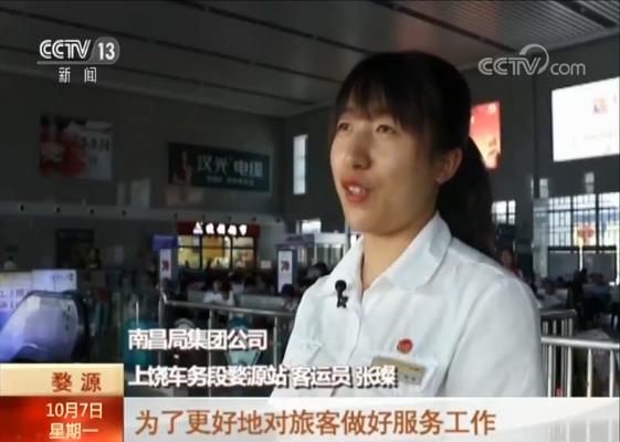 南昌局集團公司上饒車務段婺源站客運員 張璨: 我們車站的客流比平時增了51%,到達客流集中在1、2、3號,返程高峯集中在6、7號,為了更好地對旅客做好服務工作,我們車站組織熟悉周邊景區情況的工作人員到站台和出站口,為旅客提供諮詢服務,更好保障旅客出行。