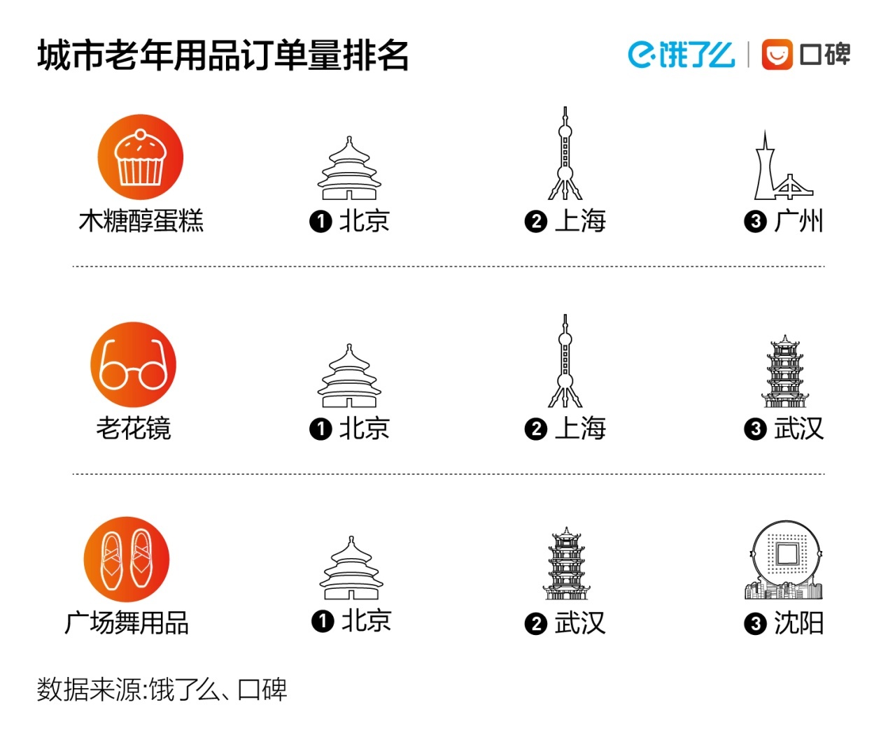 與此同時,老人及其親屬們對於餓了麼平台“應急、跑腿”功能的需求,也在呈現出爆發趨勢。餓了麼數據顯示,近一年來,老年相關商品的外賣訂單量同比去年增長超過3.5倍,醫藥類、甜品類和商超用品等外賣訂單量同比增長超過4倍。其中,送往醫院場景的訂單量較多以成人護理墊、行軍牀、坐浴盆等老人住院必備用品為主;而在商超外賣中,老人們還會熟練地下單老花鏡、廣場舞鞋、唱戲機等生活用品。