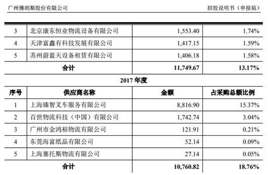 這其中,有一家重要的公司功不可沒,不得不説。這家名叫上海臻智叉車服務有限公司(以下簡稱:臻智叉車)的企業不僅是佛朗斯的大客户,還是佛朗斯的最大供應商。招股説明書稱,2017年,臻智叉車向佛朗斯採購1420萬,是公司的第四大客户;同年,佛朗斯又向上海臻智採購8816萬元,佔採購比例15.37%,臻智叉車是佛朗斯2017年度第一大供應商。
