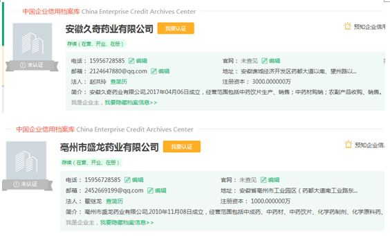 不僅如此,根據公開信息顯示,“亳州市盛龍藥業有限公司”的法人代表為翟繼龍,此人還是“亳州市昌祥藥業有限責任公司”的法人代表,這家公司已經清算註銷;“亳州市昌祥藥業有限責任公司”持股40%的股東為趙洪玲,而趙洪玲是三力製藥的參股公司“安徽久奇藥業有限公司”的第一大股東及法人代表。此外,根據水滴信用公示的信息,“亳州市盛龍藥業有限公司”和“安徽久奇藥業有限公司”的聯繫電話完全一致,均為15956728585。