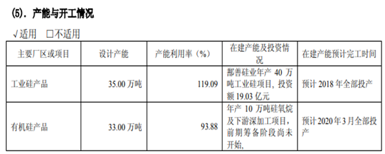 但是在2017年末,工業硅行業整體景氣度並不高,而且存在着較嚴重的產能過剩。2017年年報第18頁則對此披露了更為詳細的數據:“根據有色金屬工業協會硅行業分會統計數據,截止2017年,我國工業硅產能合計為480萬噸 /年,產量為220萬噸”。由此計算,截止當時我國工業硅產能利用率僅為45.83%、富餘產能是實際開工產能的一倍以上。