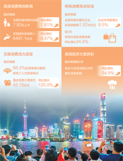 今年國慶假期,多項數據創下新高:10月1日至7日,全國實現國內旅遊收入6497.1億元,同比增長8.47%;國慶檔累計票房約42.15億元,較去年的19.08億元,同比增長120.9%;10月1日—6日,銀聯網絡交易總金額超過1.7萬億元,同比增27.7%。