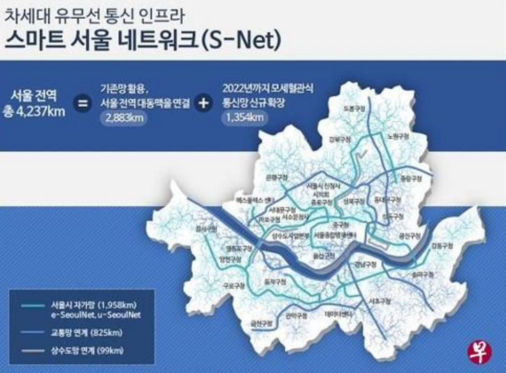 在首爾市構建獨立通信網後,計劃重點擴充福利設施、社區巴士、公園等地WiFi網絡,除確保網絡穩定運行和高速外,首爾市還計劃建成1000個物聯網基站,推廣共享停車場和在緊急情況下能夠自動報警的智能路燈等服務。