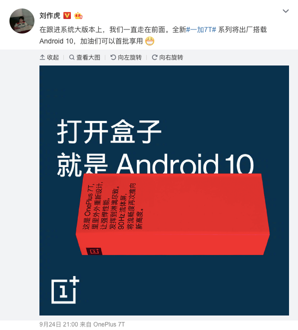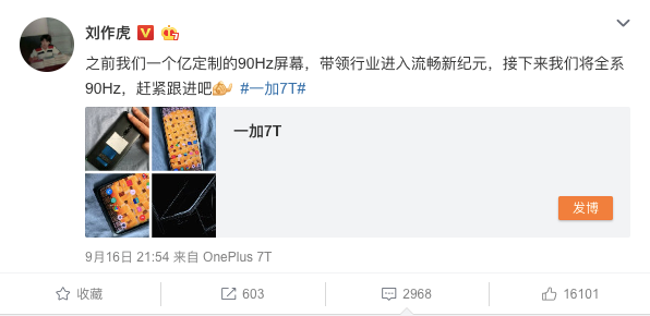早在上個月,一加科技CEO劉作虎就已經在微博上曬出了“OnePlus 7T”的小尾巴,同時也透露了不少關於一加7T的產品信息。劉作虎表示,一加7T也將採用90Hz刷新率的屏幕,接下來一加將全系90Hz。此前,一加7 Pro的90Hz流體屏憑藉着流暢跟手的體驗而廣受全球媒體和用户的好評,這一次,一加將流暢順滑的屏幕體驗帶到了更多的產品上。這也意味着,一加成為手機行業中第一家全系手機切換90Hz刷新率的廠商。