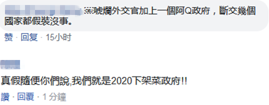 還有網友批評,“唬爛‘外交官’加上一個阿Q政府,‘斷交’幾個國家都假裝沒事”,更有人表示,“真假隨便你們説,我們就是2020下架菜政府!!”