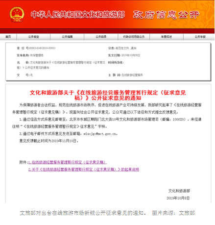 【環球網 記者 鄧雲】為保障旅遊者合法權益,規範在線旅遊市場秩序,促進在線旅遊產業可持續發展,文旅部於10月8日發佈關於《在線旅遊經營服務管理暫行規定(徵求意見稿)》(以下簡稱“《暫行規定》”)公開徵求意見的通知。