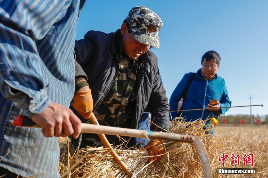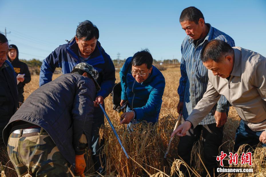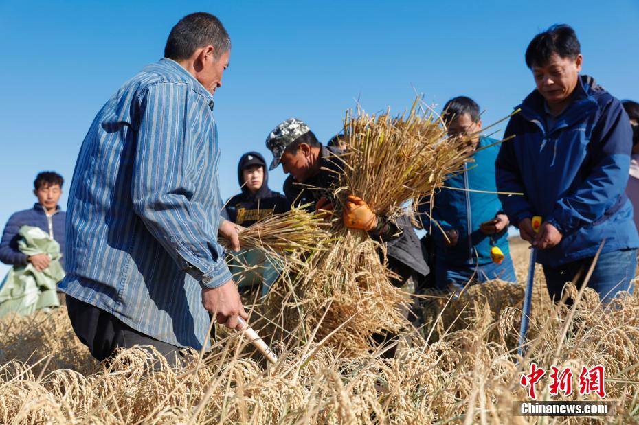 10月8日,黑龍江肇源國家雜交水稻工程技術研究中心(袁隆平鹽鹼地試驗基地)耐鹽鹼水稻接受現場測產。此次測產採用“五點取樣法”,現場隨機抽取5點(每點1平方米)進行測產,測產結果為摺合畝產403.7公斤。圖為農民在測產地點收割水稻。中新社記者 呂品 攝