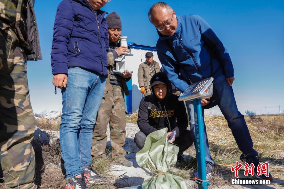 10月8日,黑龍江肇源國家雜交水稻工程技術研究中心(袁隆平鹽鹼地試驗基地)耐鹽鹼水稻接受現場測產。此次測產採用“五點取樣法”,現場隨機抽取5點(每點1平方米)進行測產,測產結果為摺合畝產403.7公斤。圖為工作人員在現場測產。中新社記者 呂品 攝