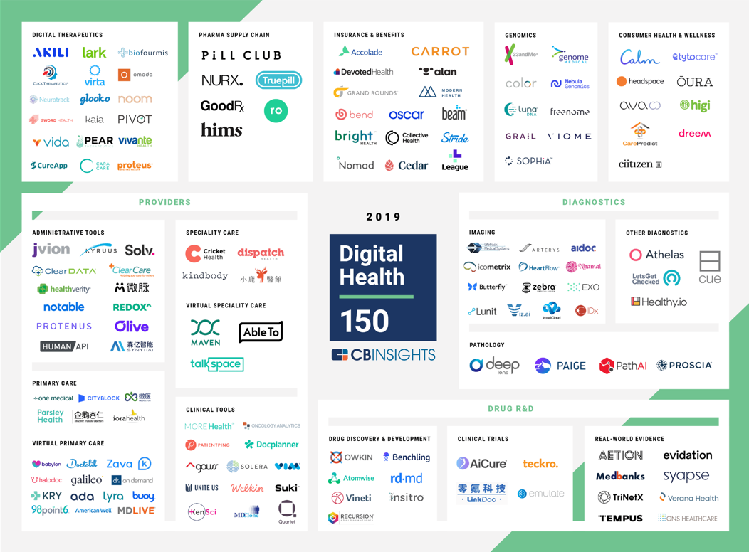 據悉,這是CB Insights史上發佈的首個數字健康榜單,這也是在世界衞生組織《數字健康全球戰略(2020-2024)》發佈後,全球範圍內提出的首份“數字健康”概念榜單。本次報告中的數字健康企業主要是指在醫療保健領域中致力於用先進技術為行業轉型提供新型解決方案的公司,包括疾病診斷、藥物研發、醫療保險以及人工智能等技術驅動的平台。CB Insights的行業分析師認為,在行業價值超過5萬億美元的醫療領域中,上榜的是最有潛力創造創新產品和服務的150家數字健康公司。
