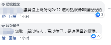 還有不少人批評所謂市議員“沒有上下班時間”説法:“這句話哪裏怪怪的”“這麼説,大家都可以利用上班時間去按摩了?”更有人怒罵:無恥、真閒。還有人批評民進黨“嚴以待人寬以律己”。