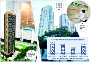 一手房市場方面,在先行示範區的光環下,房企似乎邁開了入市的步伐。據統計,9月深圳共有17個新項目入市。在龍崗寶荷片區和龍華區的一些新盤項目營銷中心,記者看到不少前來諮詢購房的置業者。在龍華片區一處新項目營銷中心,有經理對記者表示,該項目在9月30日晚線上開盤,僅僅半小時就賣出了超過300套房,國慶假期又賣出近80套。據統計,今年國慶假期(10月1日至7日)共成交412套一手住宅,同比大幅上升82.3%。