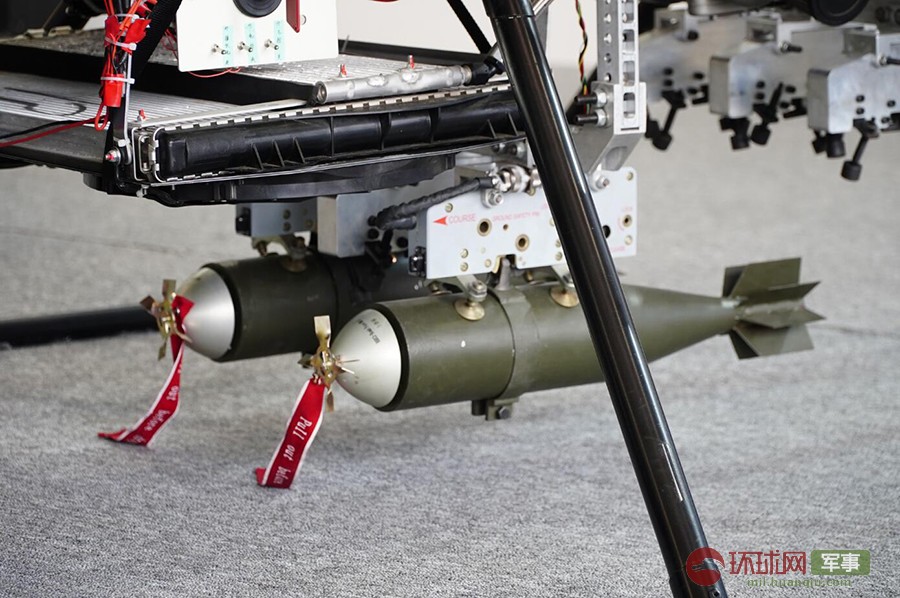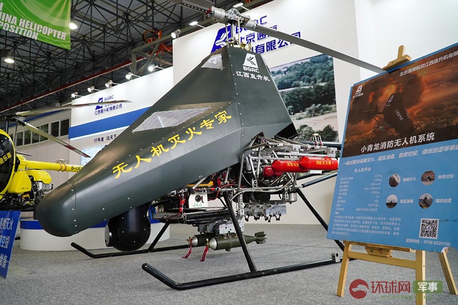 與傳統的噴水式滅火不同,無人機的高空滅火通常採用發射滅火彈藥的方式進行。在北京通航的展區裏,就展示了一款名為“小青龍”的消防無人機,該機是一站式解決高樓滅火、疫區消毒、物資空投、值班巡邏等難題的無人機裝備,最大起飛重量550千克,續航時間3小時,可採用人工遙控、半自主、全自主的飛行模式,其機身兩側和掛架和機腹掛架總共能掛載6枚消防滅火彈藥,在火場上方直接進行投放滅火。