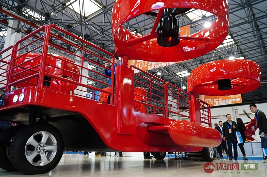 在中俄直升機展區,一款體型巨大的多旋翼飛行器相當搶眼。這款由宜通維拉公司展示的消防無人機有4個巨大的旋翼搭載裝載平台構成,在陸地上可由車輛進行託運,專門針對高樓消防滅火而設計,可搭載水箱在飛行中針對特定樓層高度進行噴灑滅火。據介紹,這款消防無人機的有效載荷為500公斤,以4台150馬力柴油/液化氣發動機為動力。除了滅火外,該無人機還能作為人員運輸平台,將高樓的被困人員運送到地面。