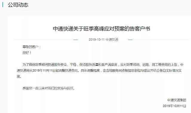 昨天,中通快遞發佈了一則“關於旺季高峯應對預案的告客户書”,稱為了確保旺季期間快遞服務安全、平穩,保持服務質量和客户滿意度,應對旺季場地、運輸、用工等費用的上漲,中通快遞將從2019年11月11日起調整快遞費用。公告中沒有明確具體的調整幅度,稱由當地服務網點根據總部指導建議並結合各自實際情況實施。