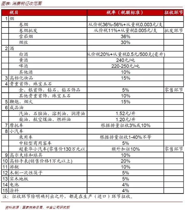 我國已對15類商品徵收消費税。來源:中金公司研報