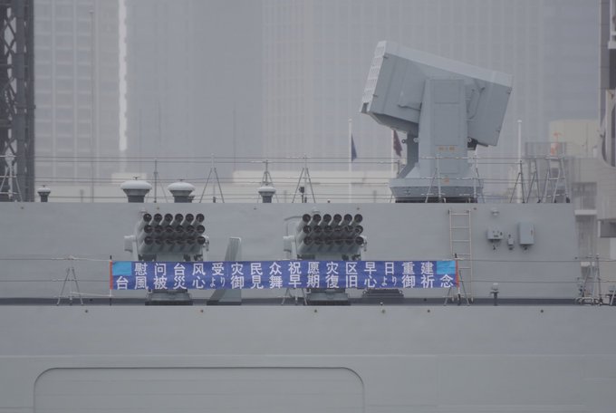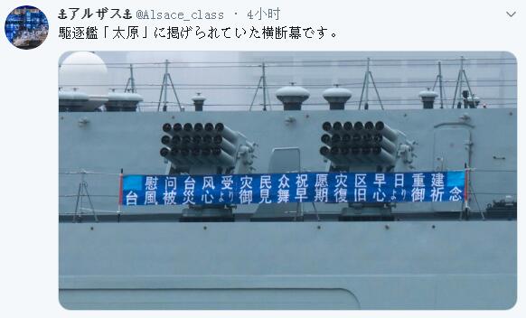 據推特網友@Alsace_class在14日上午發佈的一條消息顯示,太原艦在艦體外掛出了雙語條幅,上面用中文和日文寫着“慰問颱風受災民眾,祝願災區早日重建”的字樣。在這條推特發出的5小時內,就獲得了3600多個點贊和1900多條轉發。