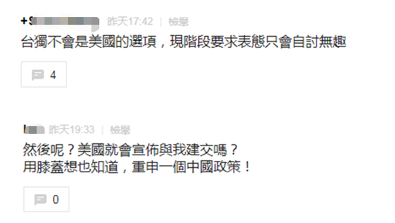 還有網友直言,“台獨”不會是美國的選項,要求表態只會自討沒趣;然後呢?美國就會宣佈與台“建交”嗎?用膝蓋想也知道,重申一箇中國政策。 ↓