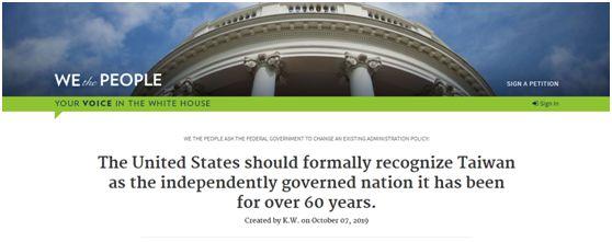 據美國福克斯新聞報道,該請願書10月7日發佈在美國白宮請願網站“(我們人民)We the People”上,請願呼籲美國承認台灣是一個所謂“獨立自治超過60年的島國”。