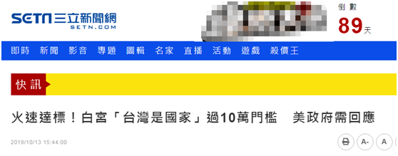 10月13日一早,“三立新聞網”便開啓了“即時關注”模式,至13日下午,請願人數達到10萬,“三立新聞網”與另一島內綠媒《自由時報》均對此進行報道,並興奮宣稱“火速達標!”“美政府需回應”。↓