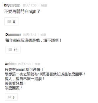 不過,綠媒興奮的同時,島內網友也一盆冷水潑了過來:“不要再關門自high了”;“每年都在玩這個遊戲,煩不煩啊!”“只要有email就可聯署,騙人、騙自己演一場戲”。 ↓