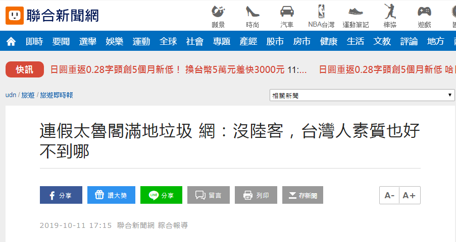 實際上,《聯合報》11日曾發佈一篇針對"太魯閣滿地垃圾"的詳細報道,文章開頭寫道,“常常會聽到有些人嘲笑陸客水平差,但台灣人真的素質比較好嗎?“並附上了一張滿地垃圾的圖片。報道稱,這張圖翻攝自一名女網友在臉書賬號"爆怨公社"貼出的照片,地點是太魯閣天祥的超商外。↓