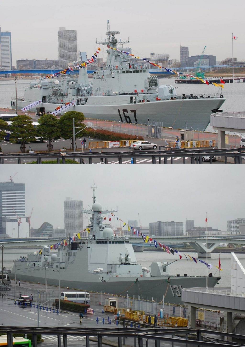 在這張對比照中可以看到,晴海碼頭的設施以及背景中的建築物基本沒有大的變化,而停靠在同樣位置上的中國軍艦,已經從051B型驅逐艦深圳艦變成了052D型驅逐艦太原艦。