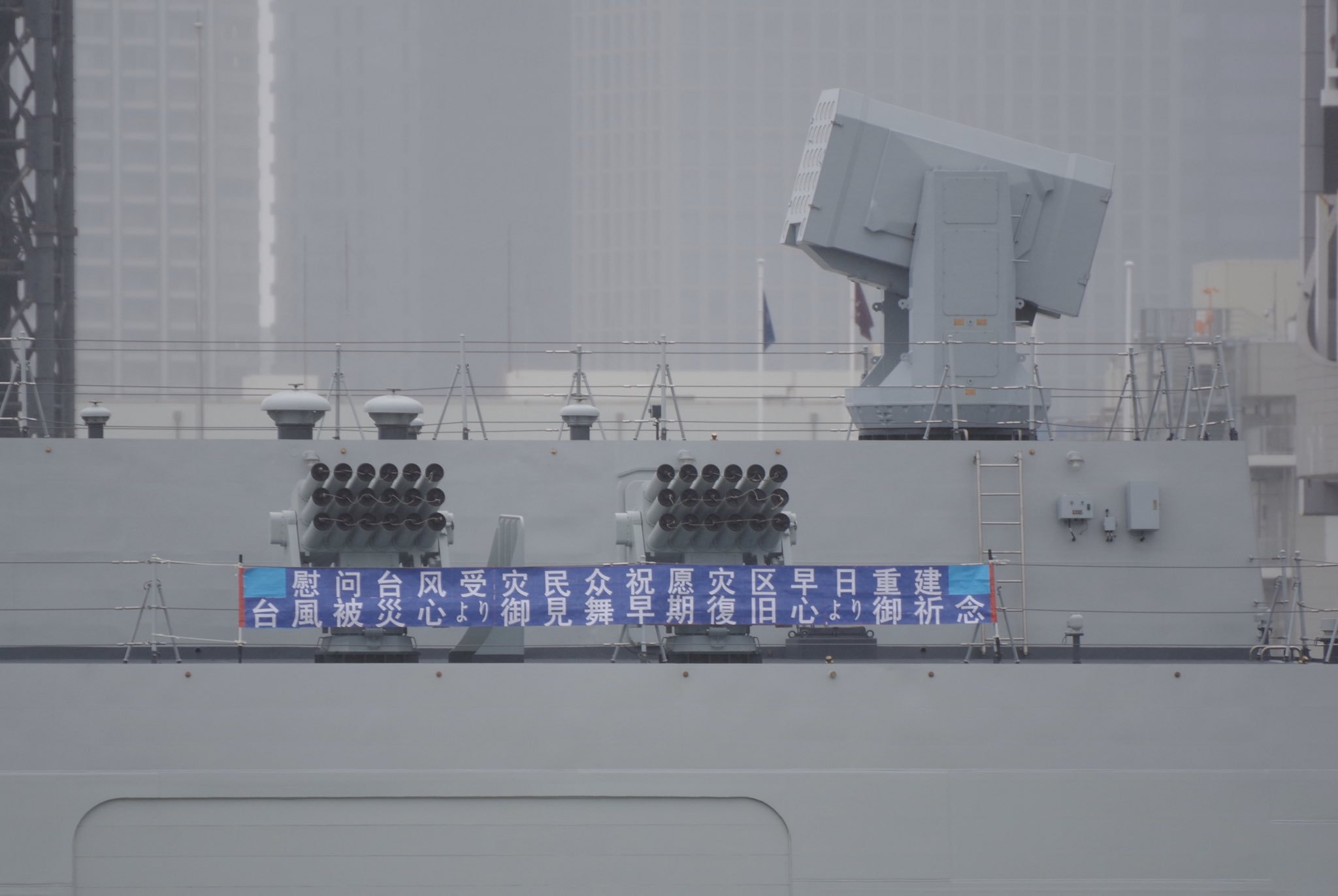 14日上午,有網友發圖顯示,抵達東京的太原艦打出寫着“慰問颱風受災民眾,祝願災區早日重建”中日雙語的橫幅。日本網友留言稱,向中國海軍表達感謝和敬意。▲
