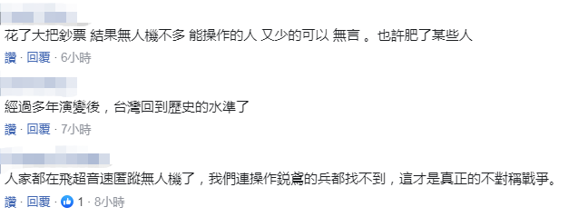 另有網友對台軍缺少能操作“鋭鳶無人機”的士兵一事諷刺稱,經過多年演變,“人家都在飛超音速匿蹤無人機了,我們連操作鋭鳶的兵都找不到,這才是真正的不對稱戰爭。” “花了大把鈔票結果無人機不多,能操作的人又少的可以,無言。也許肥了某些人。”