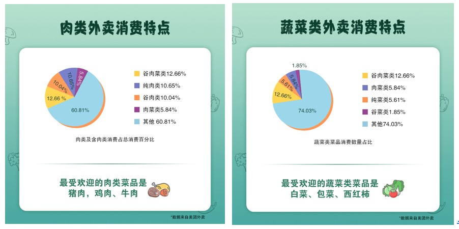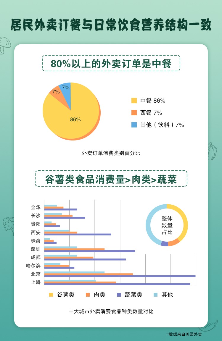此外,《我國10城市高頻外賣消費菜品膳食結構分析》報告表明,外賣用户的飲食習慣和營養結構與國民普遍飲食習慣並無太大差異,例如通過美團外賣訂餐者,以訂製正餐為主,其次是夜宵、下午茶和晚餐;排名前三的餐品類別是中餐、甜品飲品和西餐。報告通過大數據形式展示國民餐飲消費特徵之餘,對外賣訂餐存在的營養問題也有所呈現,例如十城Top50消費菜品中,排第一的均為米飯;最受歡迎的肉類是豬肉、雞肉、牛肉;最受歡迎的蔬菜是白菜、包菜、西紅柿。