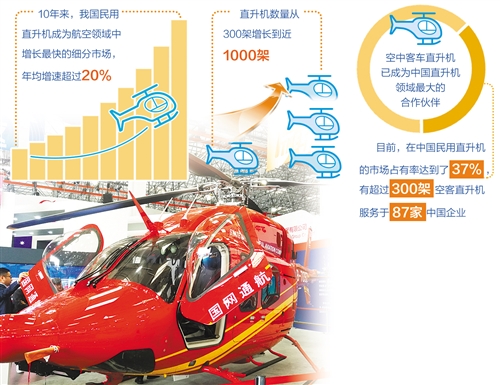 10年來,我國民用直升機成為航空領域中增長最快的細分市場,年均增速超過20%。直升機數量從300架增長到近1000架,服務於飛行培訓、空中游覽、醫療救護及傳統工農作業等多個領域。