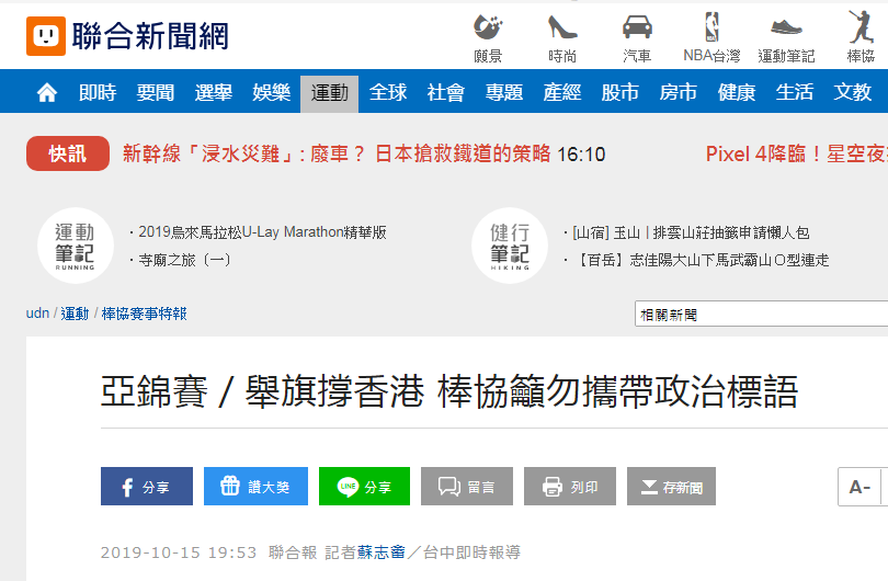 據報道,台"中華棒協"在聲明中稱,亞錦賽中國香港與中華台北隊之戰,有部分"球迷"攜帶"反修例"相關布條與標語進場,已違反正式國際賽會所遵循的奧委會模式,舉凡各單項正式國際賽事都必須遵守奧委會規定,禁止因政治、性別、膚色以及文化干擾比賽進行。
