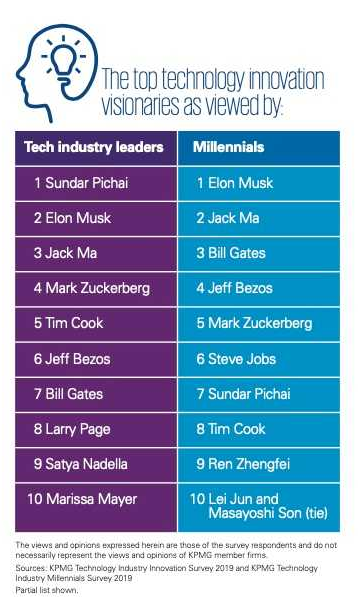 畢馬威科技產業千禧一代調查則顯示,最具創新遠見的科技領袖榜中,受訪的科技行業領袖認為谷歌CEO桑達爾·皮查伊、特斯拉CEO埃隆·馬斯克以及阿里聯合創始人馬雲位列前三名。但是在千禧一代看來,排在前三位的是馬斯克、馬雲以及微軟公司聯合創始人比爾·蓋茨(Bill Gates)。華為創始人任正非排名第九,小米創始人雷軍和軟銀創始人孫正義(masayoshi son)並列第十。