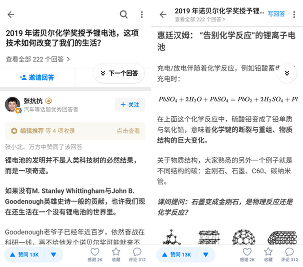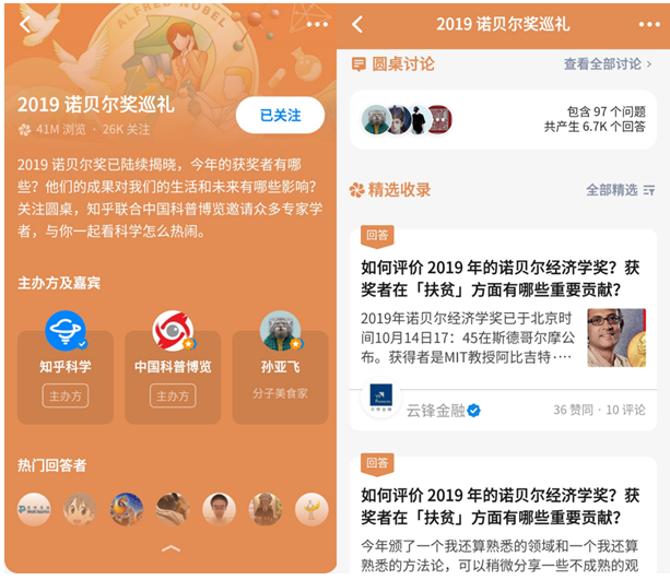 “2019 年諾貝爾物理學獎授予宇宙學理論和系外行星,對人類認識宇宙有什麼意義?”“如何評價2019 年的諾貝爾經濟學獎?獲獎者在「扶貧」方面有哪些重要貢獻?”……在知乎,諾獎所覆蓋的領域均能找到對應話題。大批科學專家、精英以及愛好者從專業角度出發,幫助更多人感受諾貝爾獎魅力。