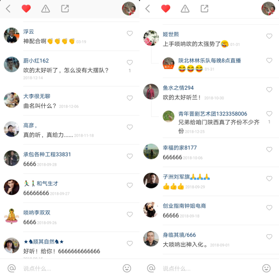 隨着互聯網走進千家萬户,古老的民間藝術遇見新演藝平台。如今,在快手直播和拍攝短視頻成了張喜林吹奏嗩吶的新舞台。去年9月,張喜林註冊了快手賬號(快手ID:708614651),聲情並茂的演奏收穫了眾老鐵的稱讚,“吹得真好”、“這才是陝北嗩吶的調調”、“黃土地的專配”……在快手老鐵的鼓勵下,張喜林把他的嗩吶聲傳得更廣更遠。