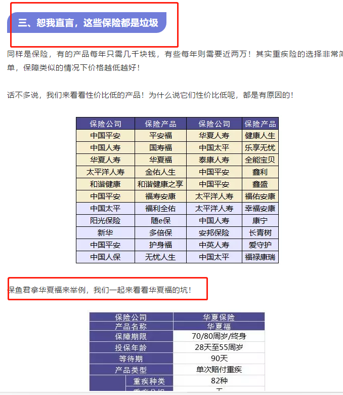 經中國網財經記者梳理,此類文章格式基本分為四部分:第一部分從中立科普的角度普及相關險種知識;第二部分將市面上大多數該類險種產品做排列對比;第三部分則羅列出其中多保魚認為不好的保險產品,甚至會單獨拿出來一款進行剖析;第四部分內容則是羅列出多保魚認為值得購買的產品,進而單獨拿出來一種優秀產品進行剖析。