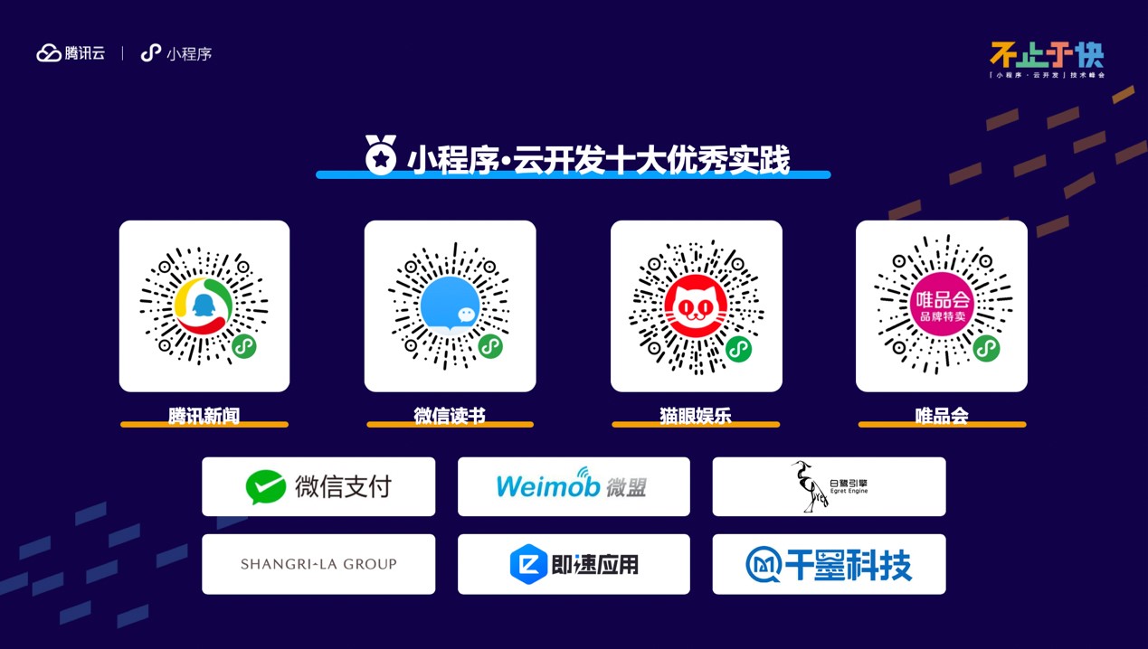 10月19日,騰訊雲聯合微信小程序團隊舉辦“小程序·雲開發”技術峯會。會上,騰訊雲首次對外公佈了“小程序·雲開發十大優秀實踐”, 包括白鷺引擎、千墨科技、騰訊新聞、即速應用、微盟、唯品會、貓眼、香格里拉、微信讀書、微信支付等,涉及多個行業。