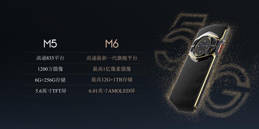 在發佈會上,8848還亮相了即將面世的5G手機M6系列,8848總裁周佳説到“我們希望帶給用户最先進、最好的產品”,這款機型將使用高通最新一代旗艦平台,最高一億像素攝像,最高12GB RAM與1TB存儲,6.01英寸AMOLED屏代表着8848的科技新高度,這也是明年安卓機型的旗艦配置。同時,M6傳承着8848一貫的奢華工藝:皮革與鈦金的結合,其設計靈感來自鐘錶、珠寶,保持品牌一貫的奢華感和價值感。加密雙系統設計,無線安全鎖技術,鈦金邊框,這些深受用户喜愛的元素也得以保留。據悉,全新M6將於明年一季度全面上市。